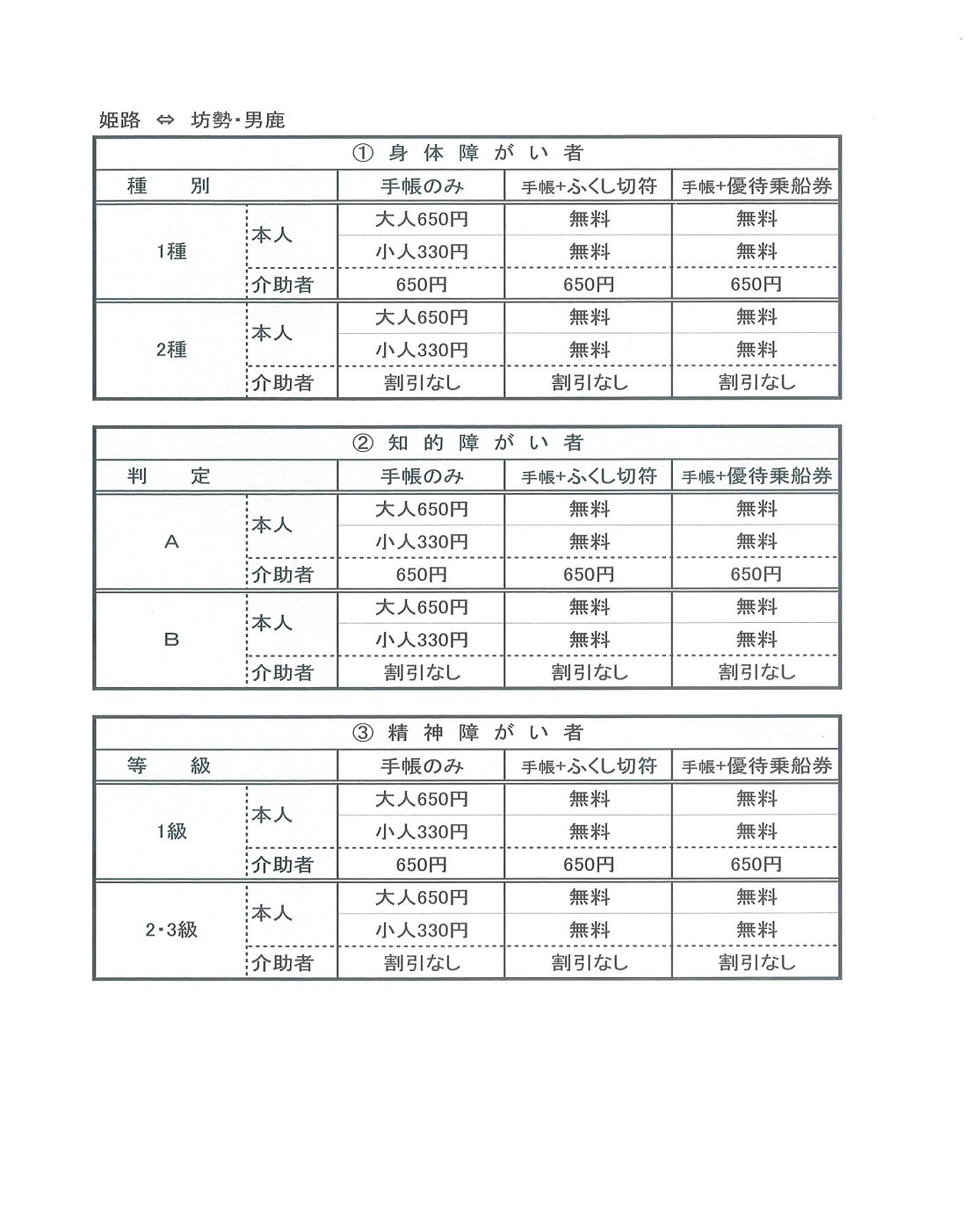 ・介助者については、障がい者1名について当社において介護能力があると認めた介助者1名が当該障がい者と同一区間を同一便で乗船する場合に適応となり、必ず2名揃っての乗船をお願いいたします。